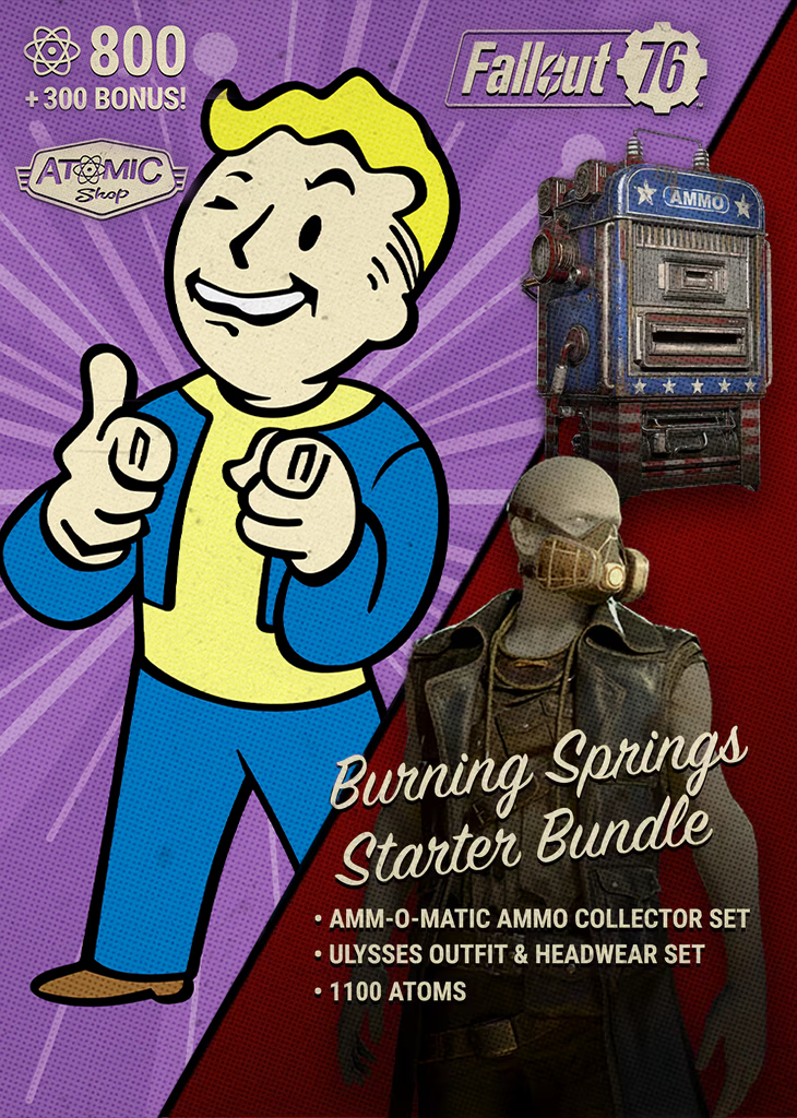 Fallout 76: Burning Springs Starter Bundle подарит свежий старт в радиоактивном мире Fallout 76. Попробуйте стильный костюм и головной убор Улисса, вооружитесь набором «Аммуматик» для сбора боеприпасов и почувствуйте себя настоящим выживальщиком. Дополнительно получите 1100 атомов для любых нужд в игре — этот набор стоит купить, чтобы сразу окунуться в приключения с преимуществом и стилем.